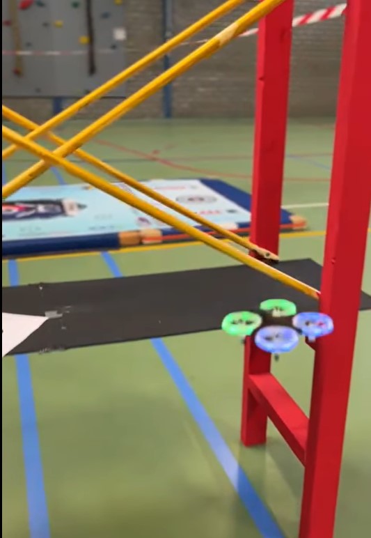 De lessen werden dinsdag afgerond met een finale-race bij ons in de gymzaal. Behendig lieten de leerlingen hun drone over, onder, langs en soms tegen de obstakels vliegen. Milan uit C2L heeft gewonnen en mag op 6 juni naar de internationale Drone Cup Finals.