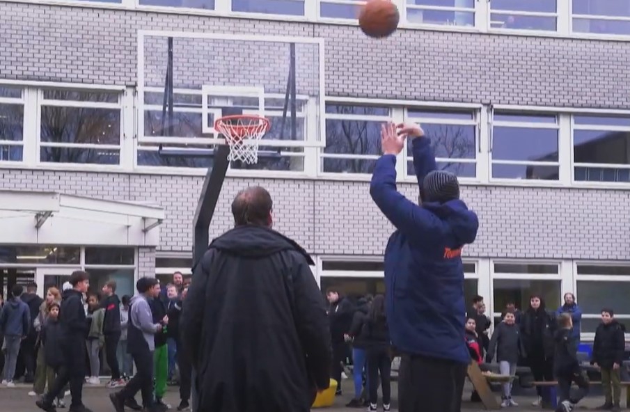 Olympisch basketballer Arvin Slagter nam het openingsschot, waarna onze leerlingen de nieuwe sportfaciliteiten meteen konden uitproberen.