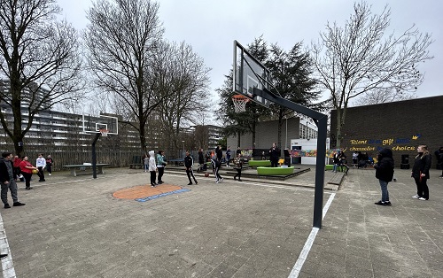 Dinsdag 21 februari hebben we ons ‘nieuwe’ schoolplein feestelijk geopend. De afgelopen weken is er hard gewerkt om van het plein een fijne sport- en chillplek te maken. Onze leerlingen (en collega’s) kunnen hier nu heerlijk voetballen in de pannakooi, basketballen, tafeltennissen en badmintonnen. Of lekker zitten en kletsen in de chillhoek. Onder leiding van onze gymdocent meneer De Frel, hebben de leerlingen zelf prachtige graffitikunst aangebracht en de lijnen van de velden geschilderd.