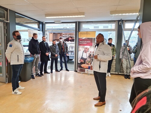 Deze week kwam oud-leerling Damian met een delegatie van ROC Mondriaan Facilitaire Dienstverlening naar onze school voor een wervingsactie onder de leerlingen Zorg & Welzijn. Voorlichters van ROC Mondriaan gaven uitleg over de opleidingen binnen Facilitaire Dienstverlening, o.a. de opleiding tot kok. Ook konden leerlingen van klas 3 en 4 Z&W zelf vragen stellen. Vanuit de foodtruck kregen zij ondertussen warme chocolademelk met slagroom en topping en een heerlijke koek.